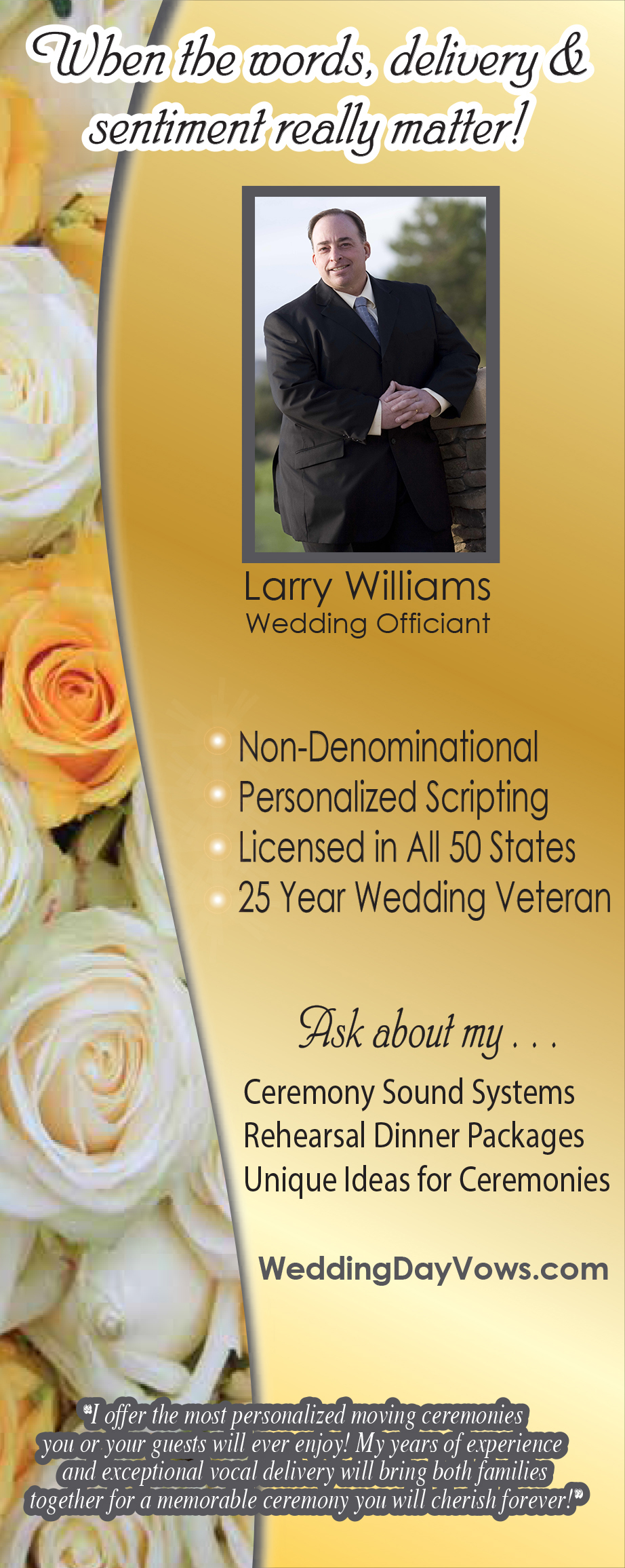 Larry Williams is a non-denominational minister who crafts and presents the area's most unique and personalized wedding ceremonies.